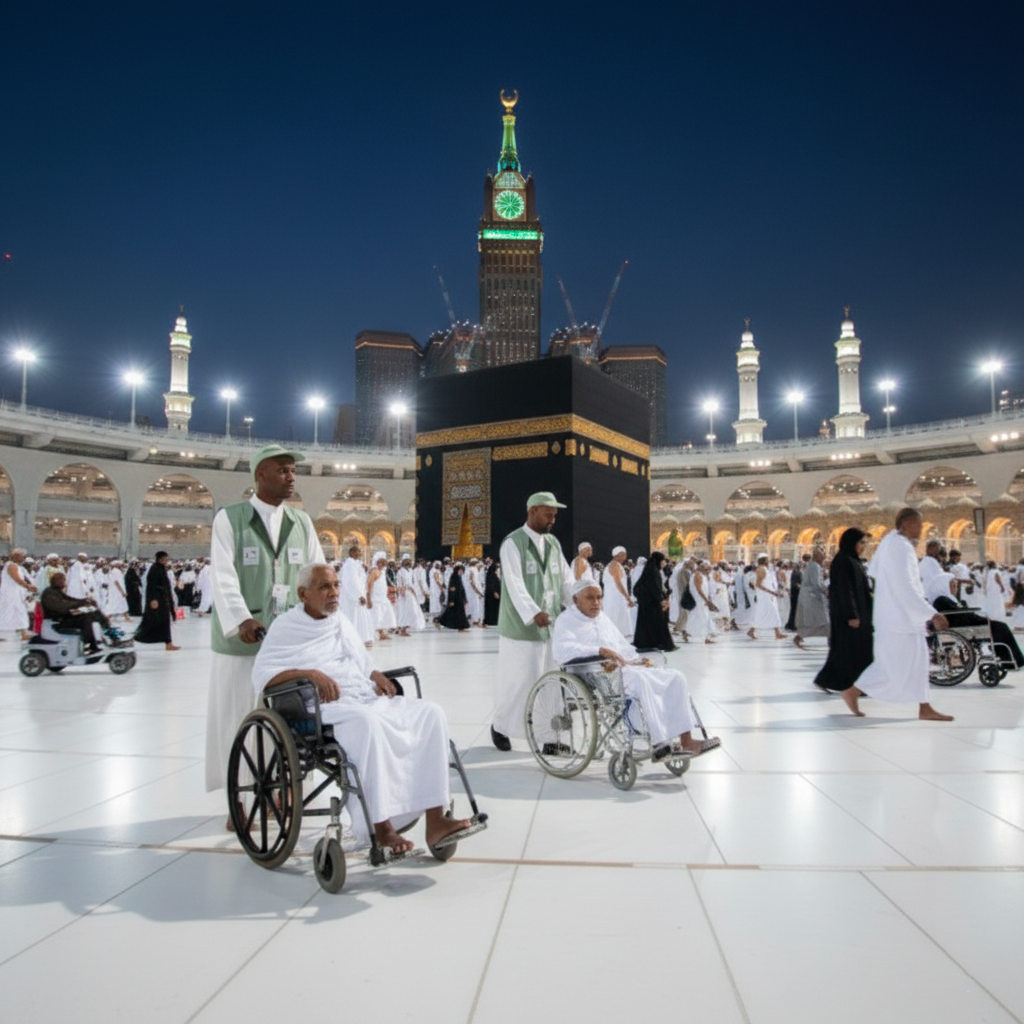 De rolstoel wordt gratis overhandigd aan pelgrims met beperkte mobiliteit in Mekka, onder toezicht van onze lokale teams en studenten islamitische wetenschappen (ṭullāb al-ʿilm).